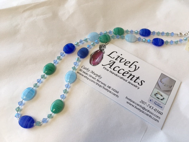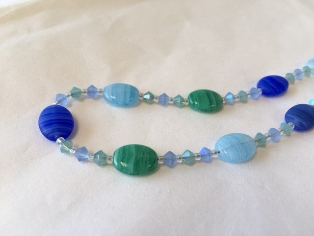 Made with smooth oval hurricane glass beads and accented with coordinating Swarovski crystals. Finished with sterling silver components.